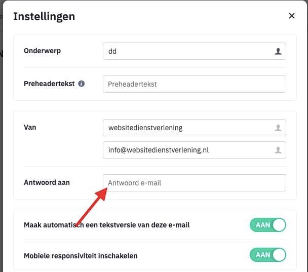 Let erop dat je ook bij het veld antwoord aan de juiste afzender invult.