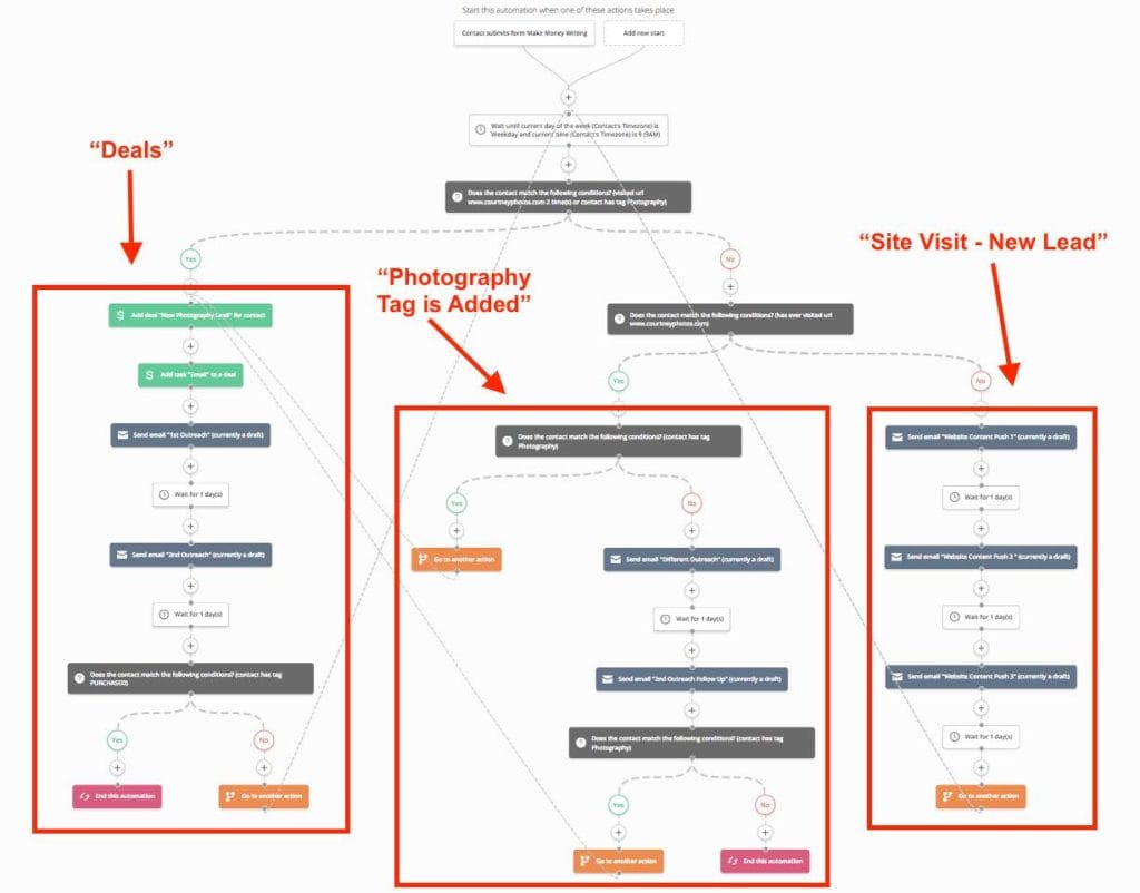 Er zitten eigenlijk 3 automatiseringen in 1 automatisering. Een gedeelte over “deals” een deel over een tag toevoegen en bij gedeelte over website bezoek.