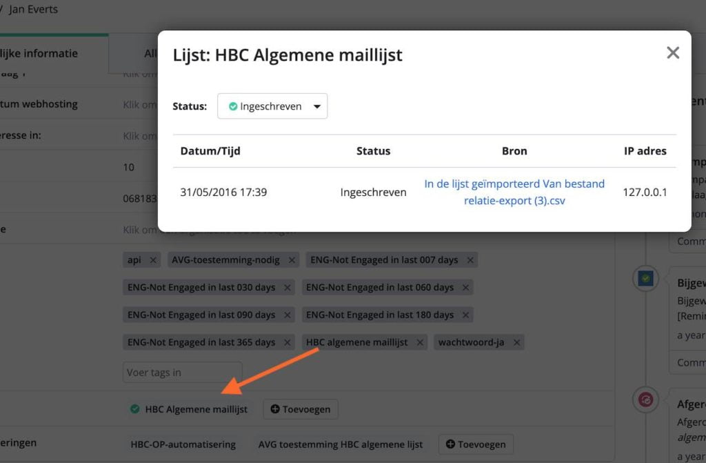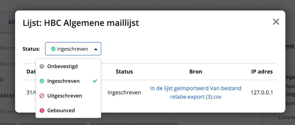 Klik op de betreffende lijst en je ziet een venster met de datum en het tijdstip waarop de contactpersoon zich heeft aangemeld, de huidige status, de bron van hun inschrijving en indien mogelijk het IP-adres waarmee ze zich hebben aangemeld.