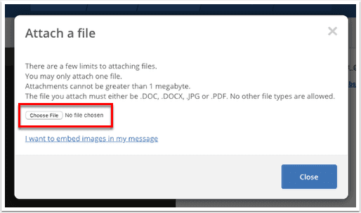 3. Klik op de knop “Bestand kiezen” om het bestand te selecteren. Je kunt slechts één bestand per e-mail bijvoegen. Het bestand mag niet groter zijn dan 1 megabyte en moet een van de volgende bestandstypen zijn: .DOC, .DOCS, .JPG of .PDF.