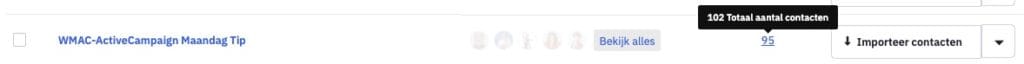 In het overzicht van lijsten staat een getal wat aangeeft hoeveel actieve contacten in de lijsten staan. Als je met de muis op het getal gaat staan, zie je hoeveel contacten er in totaal in de lijst zitten. Dus contacten die zoveel actief zijn die een andere status hebben.