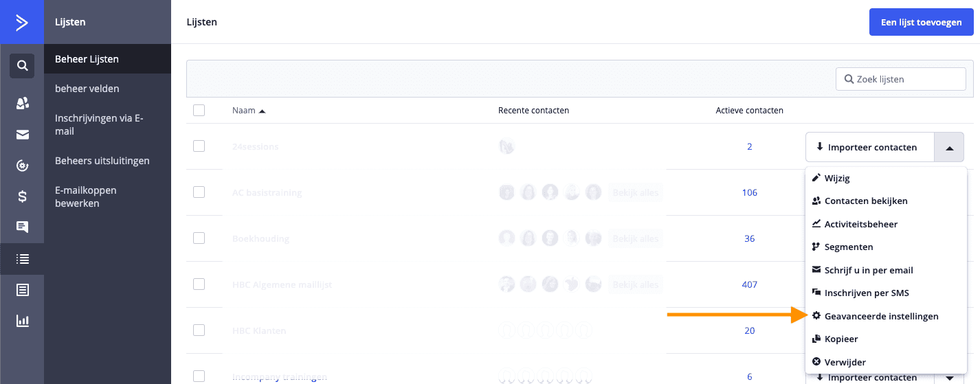 Ga naar lijsten in ActiveCampaign en klik op het pijltje aan de rechterkant naast de lijst waar je een afwijkende pagina voor wilt maken.