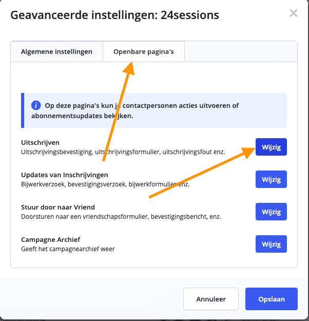 In het volgende scherm klik je op het tabblad openbare pagina’s en daarna op de knop wijzig bij het onderdeel uitschrijven.