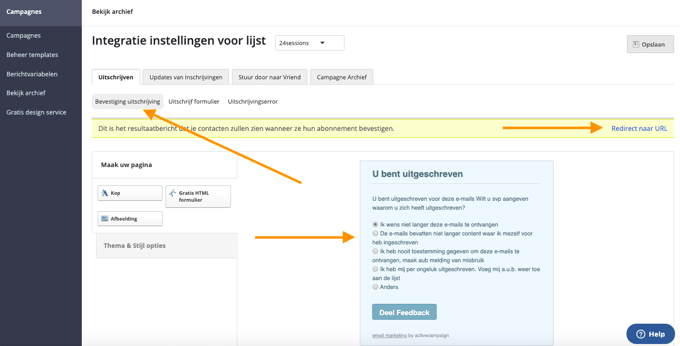 ActiveCampaign biedt de mogelijkheid om de uitschrijver door te leiden naar je eigen website. Dit geeft je de mogelijkheid om een speciaal ingerichte pagina kunt te maken.